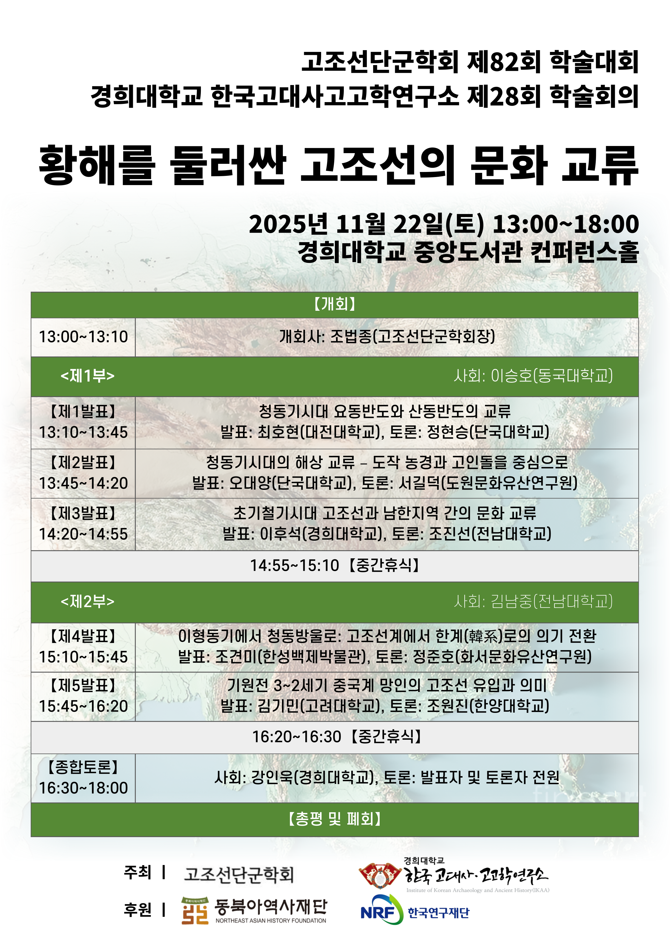고조선단군학회 2025년 제82회 학술대회 "황해를 둘러싼 고조선의 문화교류"가 개최됩니다,